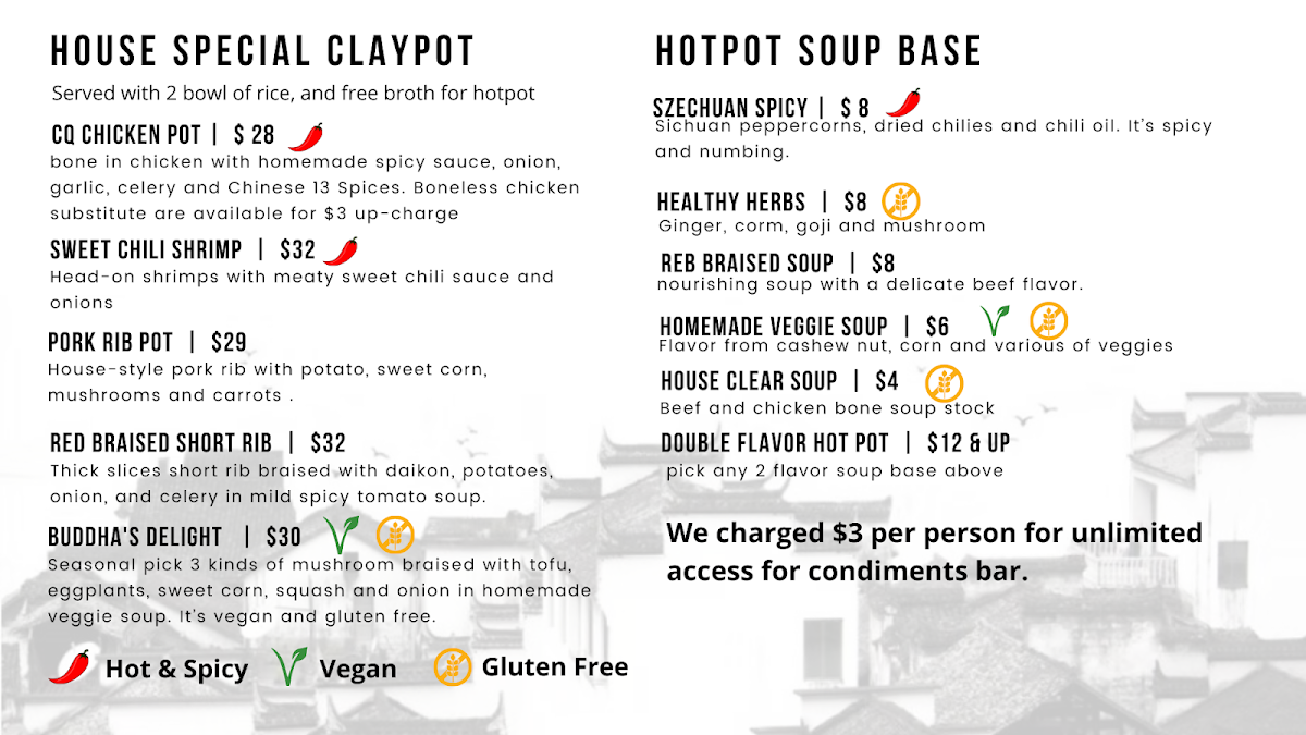 Highlights of the menu include the Tom Yum Pot, bursting with spicy and sour notes, and the invigorating Szechuan Spicy Pot, which offers a delightful balance of heat and zest. For a vegetarian option, the Tomato Pot provides a comforting, veggie-rich flavor. Don’t miss the Garlic Veggie Claypot Rice, a delicious medley of mushrooms and garlic sauce.